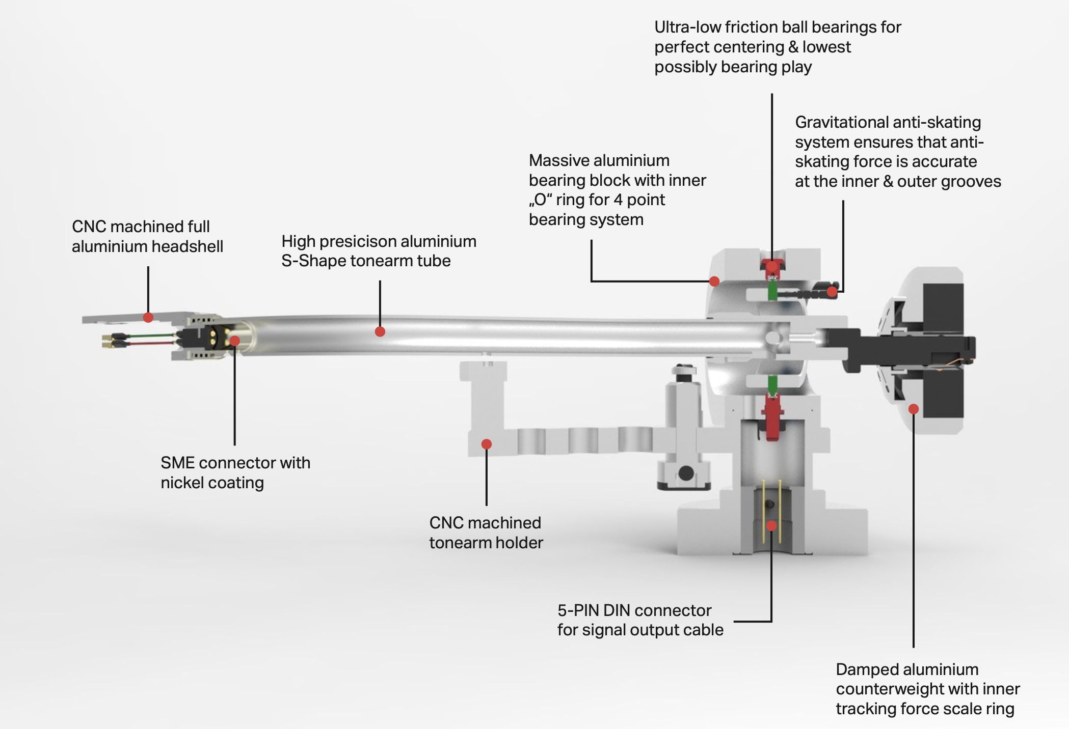 Der neue EVO-Tonarm verwendet ein invertiertes kardanisches ABEC7-Qualitätslager mit vier Edelstahlspitzen. Dieser Lagertyp ist sehr stabil und reibungsarm, was eine klare Abtastung garantiert. Das Ergebnis ist eine detaillierte und offene Klangbühne. Die gesamte Mikroinformation der Rille bleibt erhalten. Das Lager sitzt in einem Vollaluminiumgehäuse, das für die nötige Stabilität sorgt. Der massive Außenring ist offen, um Resonanzen zu vermeiden. Dank des Tonarmdesigns ist das Lager wartungsfrei und sehr einfach zu justieren.
